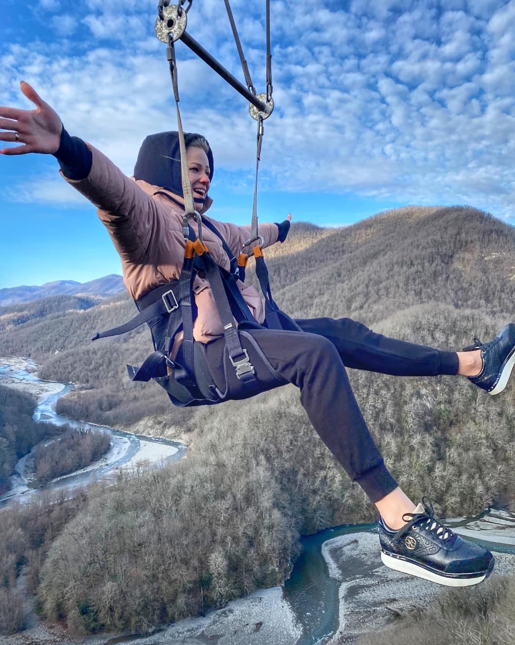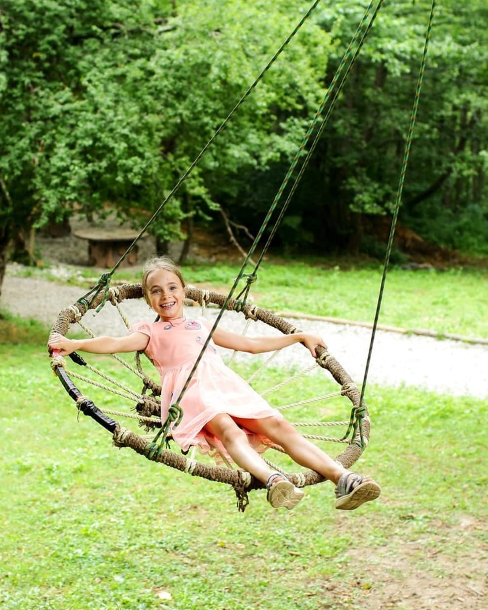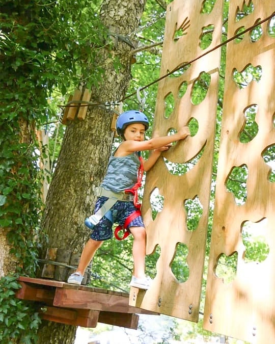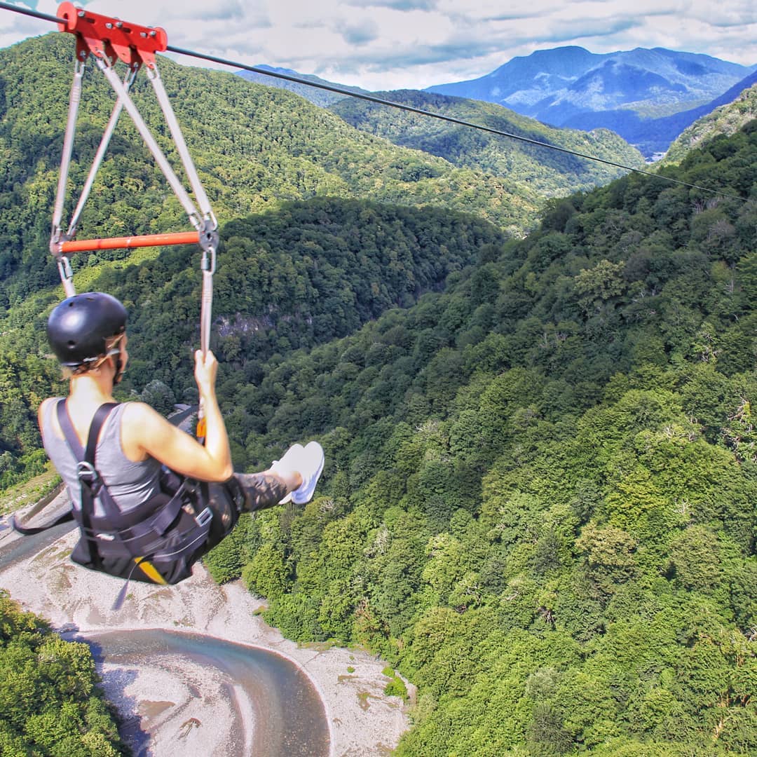 Троллейный парк. Это перемещения по металлическому тросу от старта к финишу сидя в подвесных мешках.